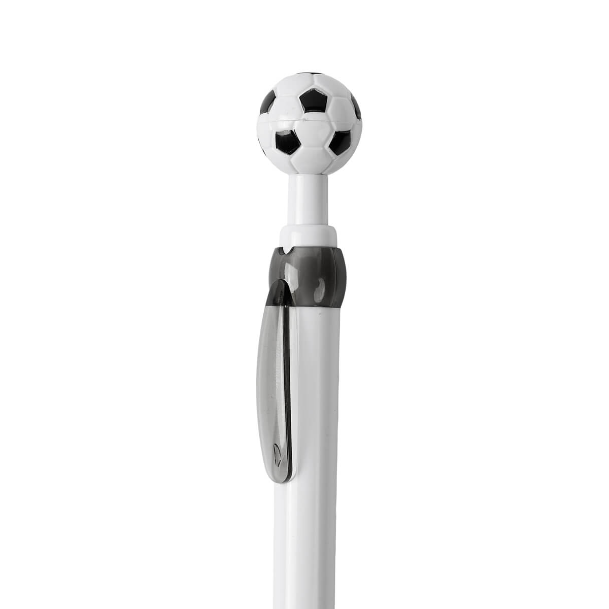 Bolígrafo con diseño deportivo, ideal para los amantes del fútbol. Cuenta con un adorno en forma de balón en la parte superior, mecanismo pulsador.